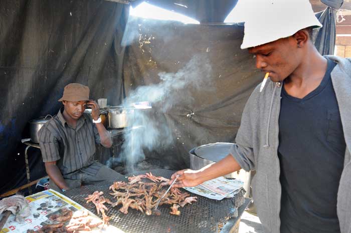 Musa Bhengu looks on as the customer picks the braaied chicken feet at Bara taxi rank, 28 May 2014. Bhengu has been supplying hungry commuters since 1999. Picture: Nigel Sibanda